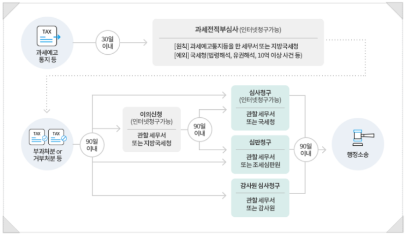 "세법 제55조(불복)에 의하면 세법에 따른 처분으로서 위법 또는 부당한 처분을 받거나 필요한 처분을 받지 못함으로 인하여 권리나 이익을 침해당한 자는 이 장의 규정에 따라 그 처분의 취소 또는 변경을 청구하거나 필요한 처분을 청구할 수 있다"라고 명시되어 있습니다.